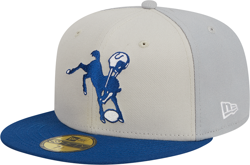 The Indianapolis Colts Sideline Historic 59FIFTY Fitted Hat by New Era brings a unique twist to classic team gear. Featuring a cream crown, grey rear panels, and a bold blue visor, this cap stands out with a vintage-inspired graphic of a Colts player mid-action.