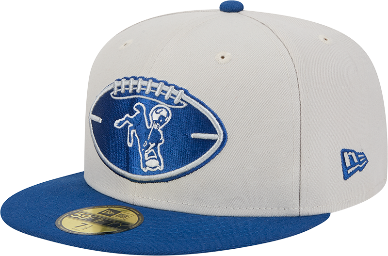 A standout Colts fitted hat featuring a football-shaped vintage graphic, cream crown, and blue visor. Unique, clean, and built for true fans.