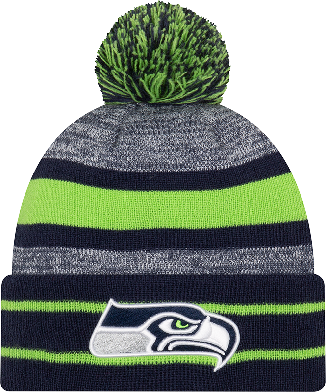 Stay warm while repping your team with this Seattle Seahawks New Era Knit Cuffed Pom Beanie. Designed with a soft, stretch-knit construction, this beanie delivers all-day comfort and cold-weather warmth. The classic cuffed silhouette features an embroidered Seattle Seahawks logo on the front, while bold navy, gray, and neon green striping adds unmistakable team style. Finished with a matching pom on top, this officially licensed beanie is perfect for game days, outdoor activities, or everyday wear during the colder months.