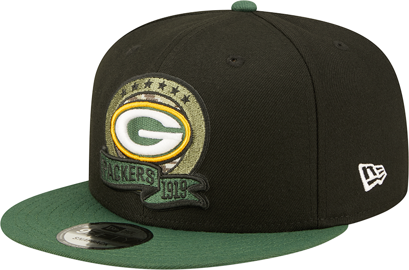 Top off your look with the Men's New Era Black/Green Green Bay Packers 2022 Salute To Service 9FIFTY Snapback Hat, a premium snapback hat built for comfort, clean style, and everyday team pride.